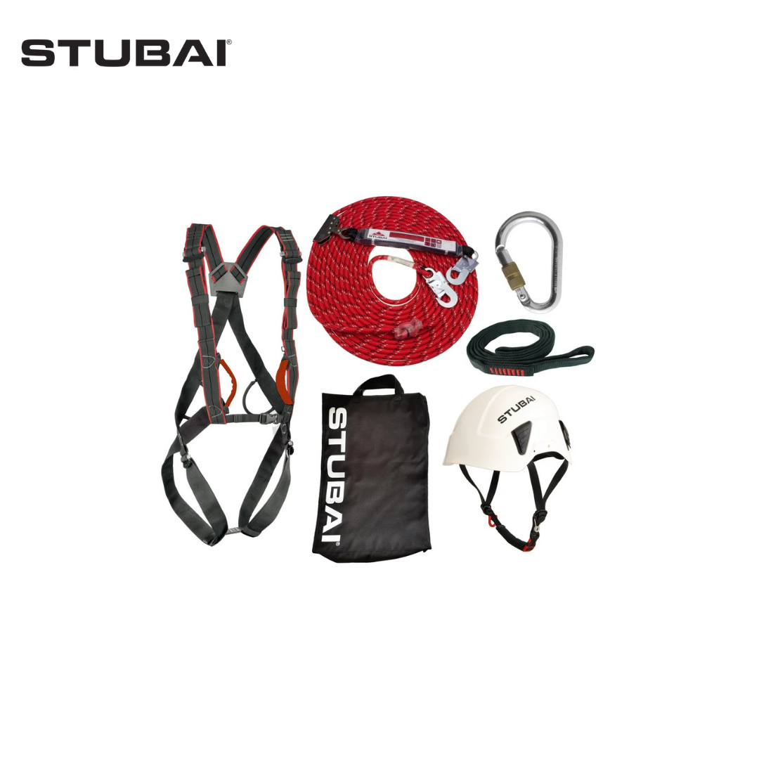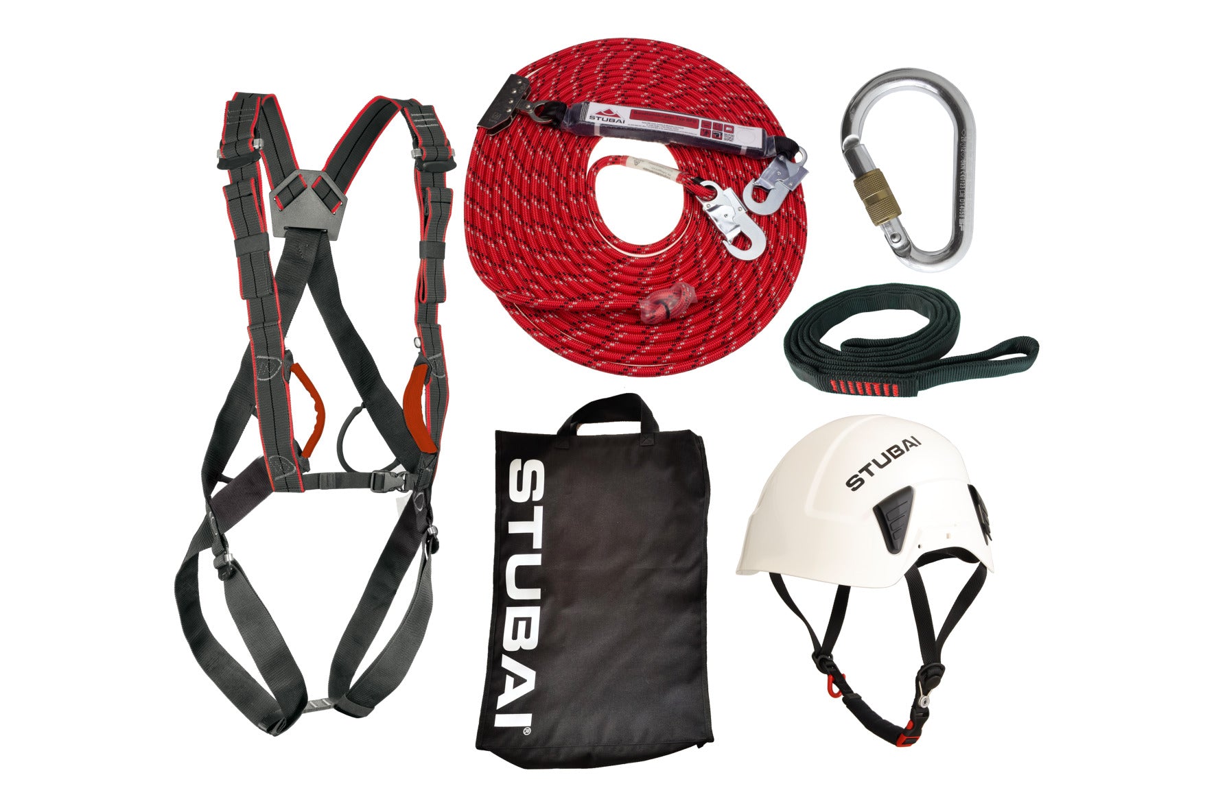 Das Dachdecker Set PSA Basic Plus ist ideal für Anwender die eine horizontale oder vertikale Sicherung für den Zugang auf Dächern benötigen. Zugelassen für den horizontalen und vertikalen Einsatz, für Benutzer bis 120 kg. Das obere Ende ist mit einem Karabiner mit Handballensicherung versehen, das untere Ende ist mit einem Knoten versehen. Außerdem ist eine 60 cm lange Bandschlinge und ein Stahl HMS Karabiner enthalten. Das Set wird in einer großen Transporttasche mit Klarsichtfenster zur Identifikation geliefert.
